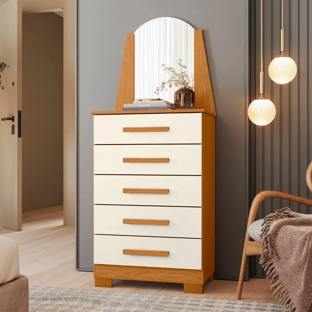 Equipado con cinco cajones, este mueble ofrece un amplio espacio de almacenamiento para ropa, accesorios y otros objetos personales. Las correderas telescópicas garantizan un deslizamiento suave y fácil acceso a su contenido, mejorando la experiencia de uso. Las manijas y patas añaden un detalle estético que complementa su diseño contemporáneo.