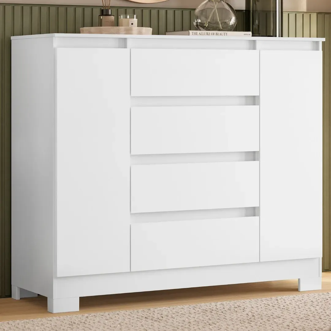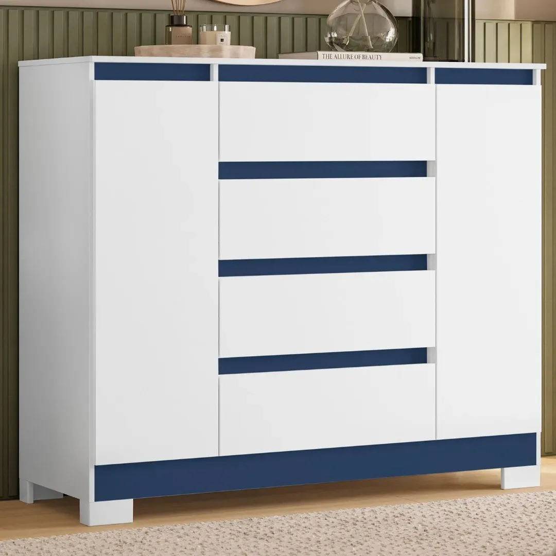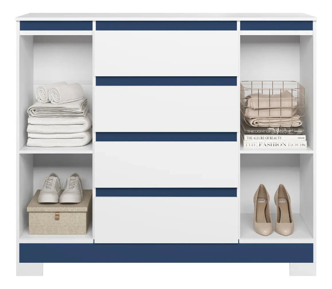 Cuenta con 4 cajones con rieles telescópicos, que garantizan una apertura suave y completa. Además, incorpora 2 puertas con estantes internos, perfectos para organizar zapatos o artículos de mayor tamaño.