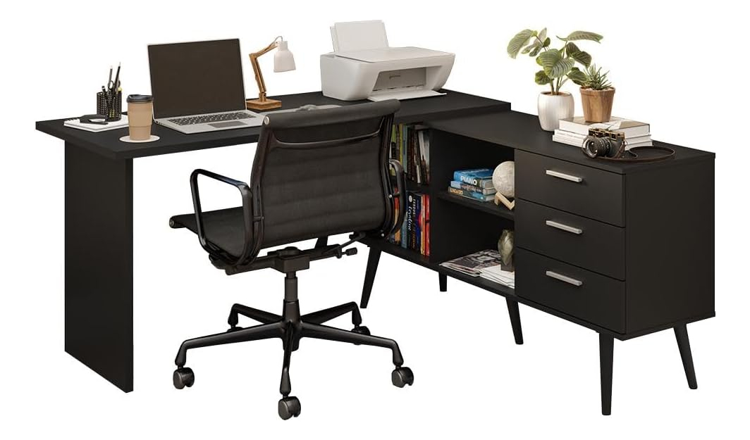 Su diseño en forma de L permite optimizar el área disponible, adaptándose perfectamente a cualquier rincón de tu oficina o estudio. Fabricado en MDP.
