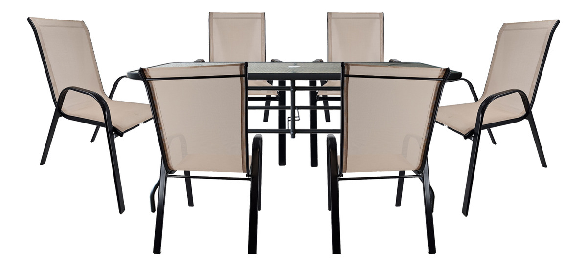 Disfruta de tu tiempo al aire libre con el elegante Juego Jardín Exterior, que incluye una mesa rectangular y seis sillas, ideal para tu balcón, patio o piscina. La mesa, fabricada en robusto acero con pintura epoxi, está equipada con un elegante vidrio templado esmerilado de 5 mm de espesor y cuenta con un práctico agujero de 38 mm, perfecto para sombrillas de 2.70 mts. Las sillas, resistentes hasta 115 kg cada una, ofrecen un diseño ergonómico con una profundidad de 71 cm, altura de 93 cm y un ancho de 54 cm, garantizando la comodidad de tus invitados. Este conjunto no solo es atractivo, sino también funcional, ya que no requiere ensamblado, facilitando su uso inmediato. Con un total de siete piezas, este juego es la elección perfecta para tus reuniones al aire libre.