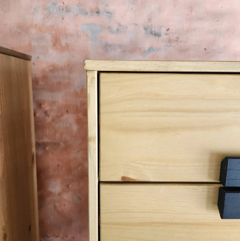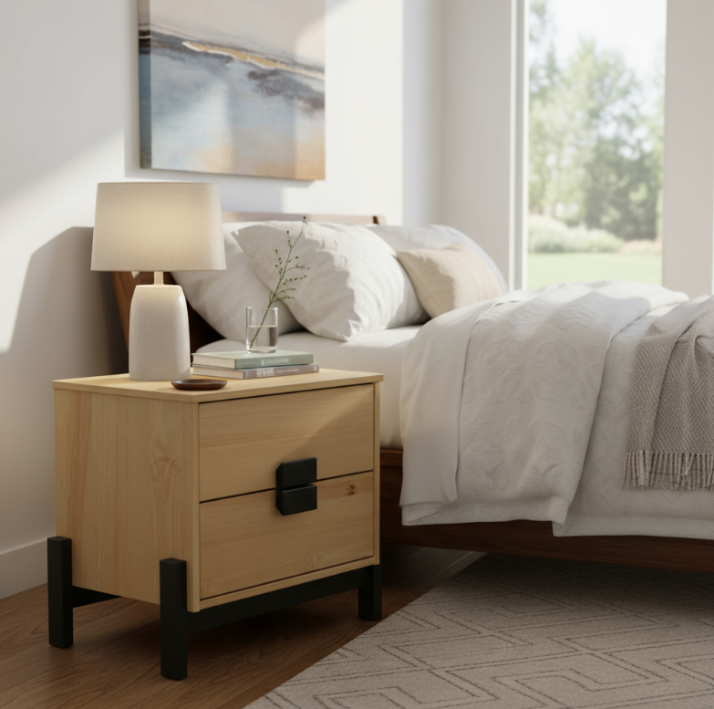 Fabricada en madera maciza. Equipado con dos cajones, ofrece el espacio ideal para guardar libros, cargadores y pequeños objetos personales, manteniendo tu habitación siempre organizada y libre de desorden. El diseño de la Mesa de Luz combina sencillez y elegancia, convirtiéndose en un elemento práctico y estético para tu dormitorio.