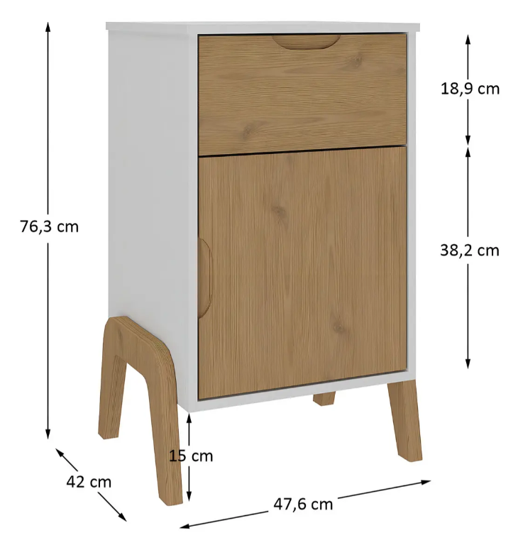 La Mesa De Luz Dormitorio 1 Cajón 1 Puerta Cabecera Sommier de la línea Veneza de Muebles Web es la solución perfecta para quienes buscan funcionalidad y estilo en su dormitorio. Con unas dimensiones de 76,3 cm de altura, 47,6 cm de ancho y 42 cm de profundidad, se adapta a cualquier espacio, ofreciendo un diseño elegante y práctico.