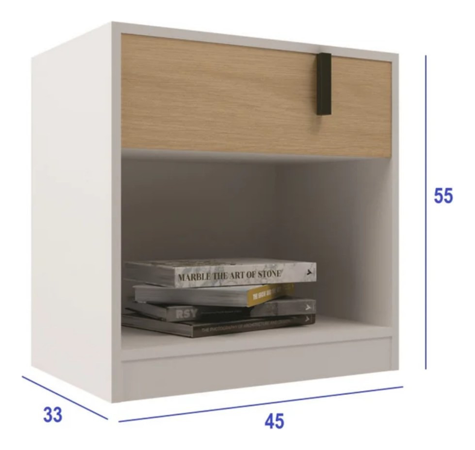 Fabricada en MDP, esta mesa de luz cuenta con un cajón que proporciona un espacio adicional para almacenar tus objetos personales, manteniendo tu habitación ordenada. Además, incluye un estante que permite exhibir tus libros, lámparas o elementos decorativos, añadiendo un toque personal a tu ambiente.