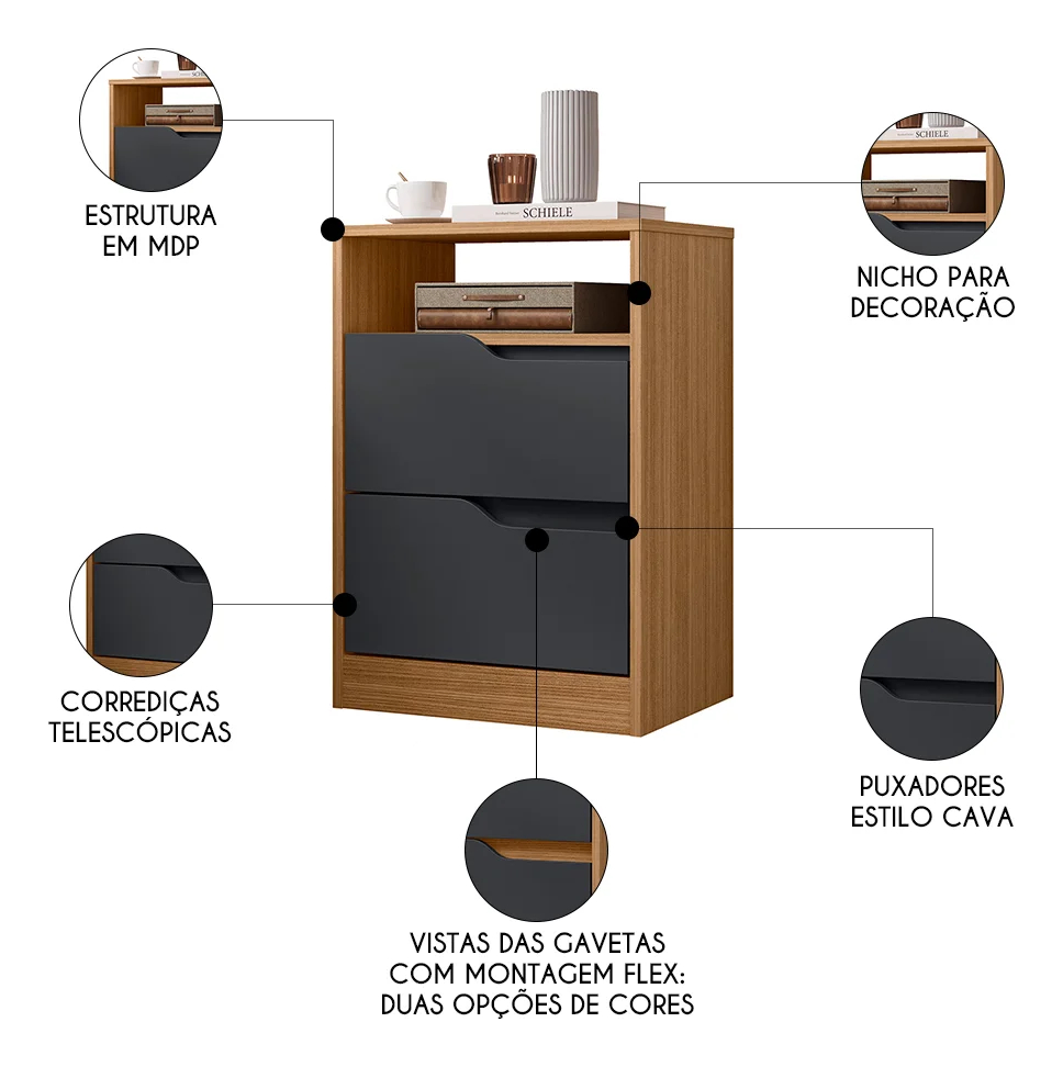 Con sus dos cajones espaciosos y manijas huecas, esta pieza ofrece espacio adicional para guardar sus pertenencias personales, manteniéndolas organizadas y al alcance de la mano, mientras que las guías telescópicas aseguran un deslizamiento suave de los cajones, permitiendo un acceso fácil y sin esfuerzo. Además, también cuenta con un estante abierto, perfecto para exponer objetos decorativos o guardar libros y revistas.