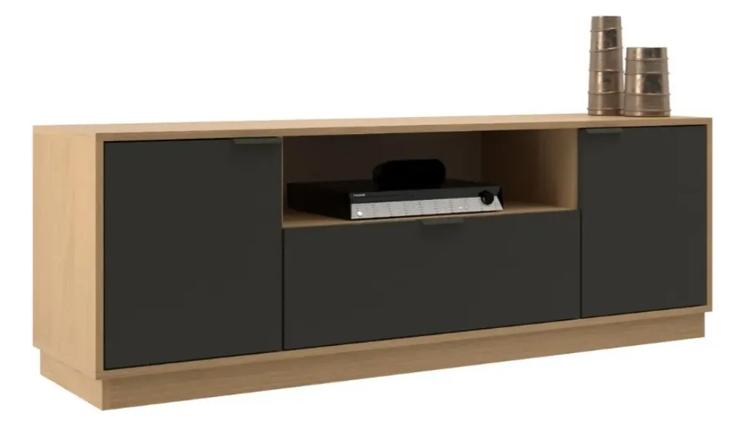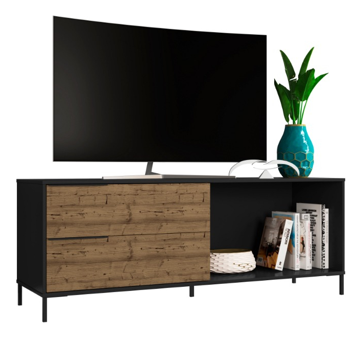 Rack 2 cajones con capacidad de TV 65 pulgadas, terminación pintura UV, tiradores y patas metálicas.