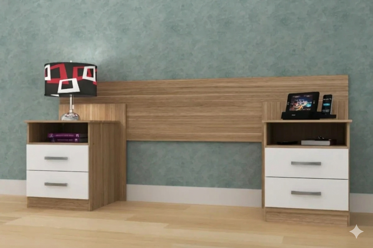 Este conjunto es perfecto para camas de 2 plazas, garantizando estilo en tu habitación. Mejora tu experiencia de descanso y organización con este elegante respaldo y sus mesas de luz, que se integran a la perfección en tu hogar.