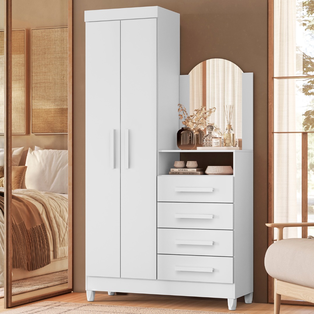 Cuenta con una distribución inteligente que incluye cajones amplios con rieles telescópicos (apertura suave y total), tiradores en MDF revestido y una práctica cajonera tipo tocador. Además, incorpora un delicado espejo curvo que aporta un toque único y funcional.