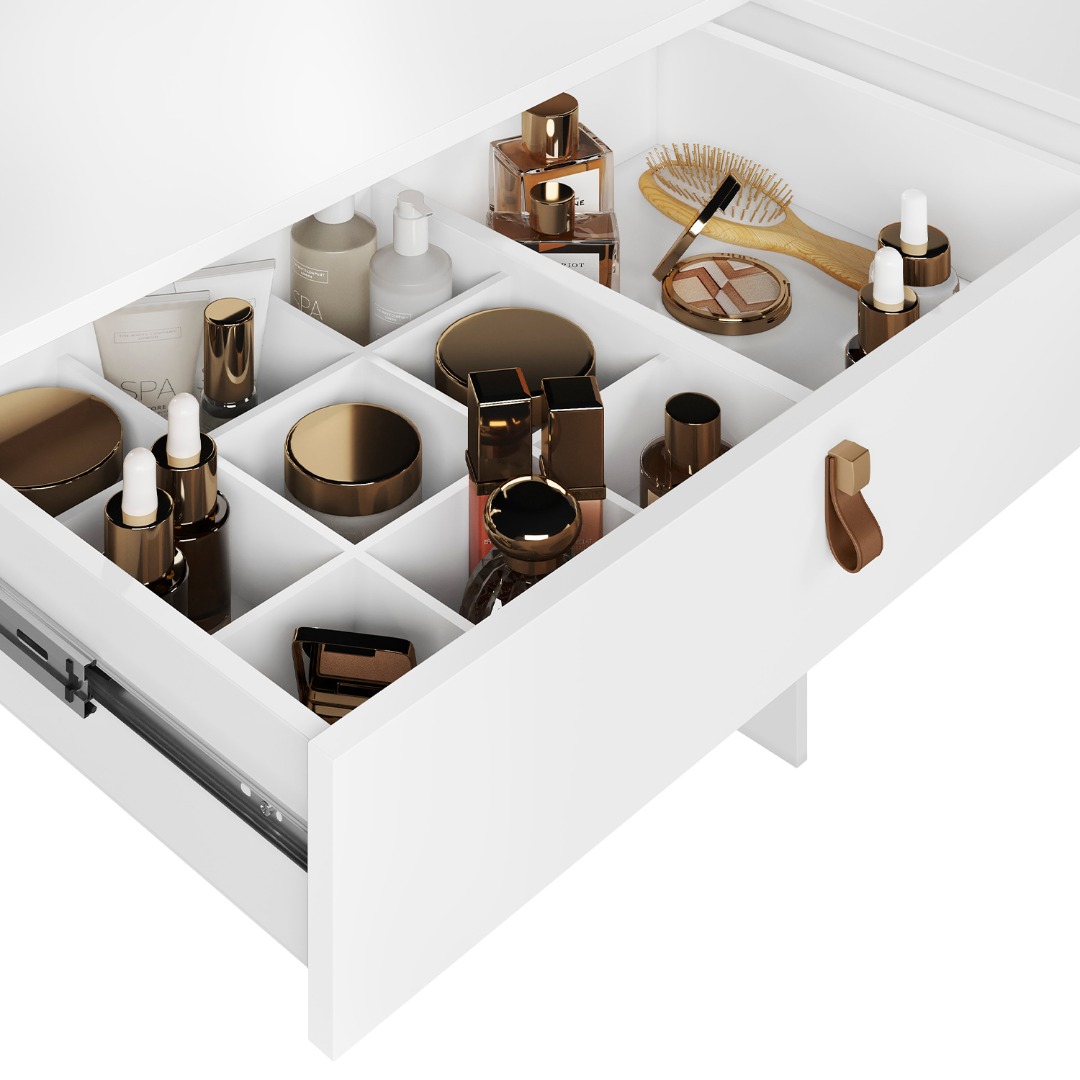 Cuenta con 1 cajón con guías telescópicas, lo que asegura una apertura suave, silenciosa y resistente al uso diario. Además, incorpora organizadores con separadores, pensados para que tengas todo a mano y perfectamente ordenado: maquillaje, accesorios, productos de cuidado personal y más.